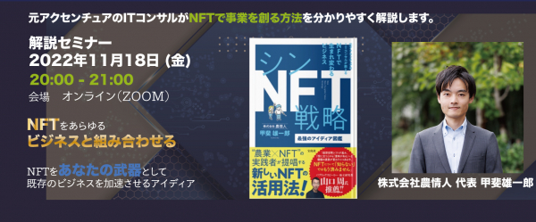 社会のインフラになるNFT! 元アクセンチュアのITコンサルがNFTで事業を創る方法を分かりやすく解説します。 特別ゲストとして農テラス 山下氏が参戦します! 「農業×web3」の先駆者としてNFT事業づくりを手掛ける農情人の代表 甲斐雄一郎が執筆した書籍『シンNFT戦略 最強のアイディア図鑑』が2022年11月18日に宝島社より発刊します。プレスリリース