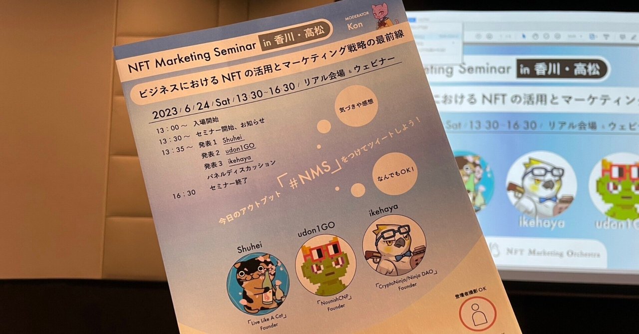 2023年6月24日(土)、ボクの地元である香川県高松市で「NFT Marketing Seminar in 香川・高松 ビジネスにおけるNFTの活用とマーケティング戦略の最前線」というセミナーが開催されました。 登壇者は ・「Live Like A Cat」ファウンダー しゅうへいさん ・「Nounish CNP」ファウンダー udon1GOさん ・「CryptoNinja/Ninja DAO」ファウンダー イケハヤさん モデレーターは ・「NFT Marketing Orchestra」主催 …