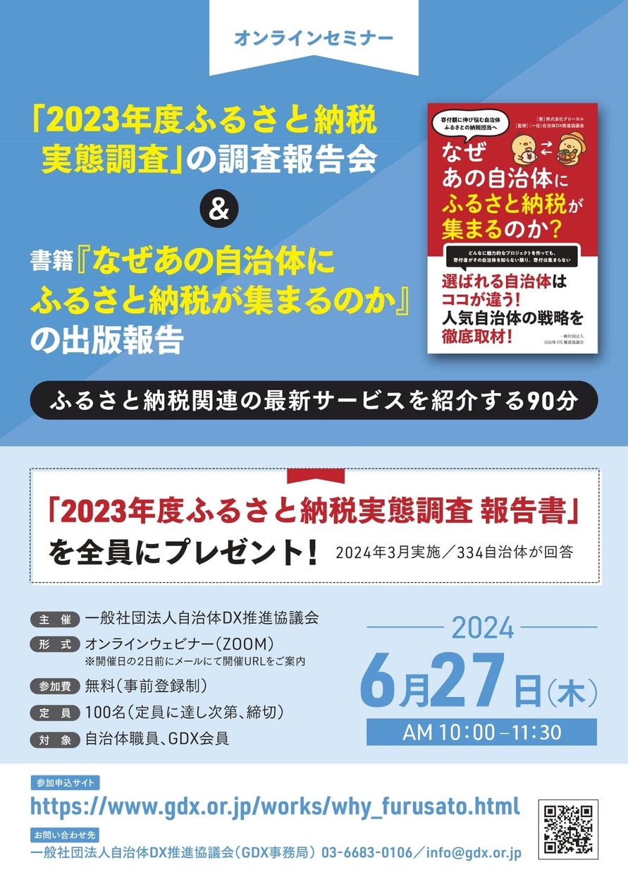 【申込自治体100名突破につき、増枠(100名→300名)】<2023年度ふるさと納税実態調査報告会>オンラインセミナー『なぜあの自治体にふるさと納税が集まるのか?』を2024年6月27日(木)に開催