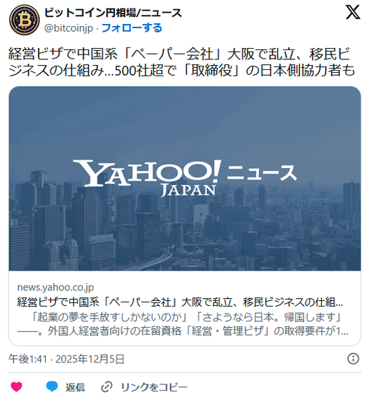 1 名前::2025/12/05(金) 12:04:35.32 ID:vCAQpVb/0●.net 経営ビザで中国系「ペーパー会社」大阪で乱立、移民ビジネスの仕組み…500社超で「取締役」の日本側協力者も https://t.co/mol0iX0Ctw— ビットコイン円相場/ニュース (@bitcoinjp) December 5, 2025 ...