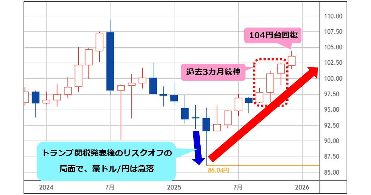 【2026年のFX予想】豪ドル/円に注目したい。RBAがタカ派に転じ、来年はリスク再始動の年となりそうで、モルガン・スタンレーは豪ドルがFXでもっとも恩恵を受ける通貨ペアだと予想している。仮に来年、米金利が低下してドルインデックスが下がっても、円高は一時的となりそうだ。その結果、欧州通貨のクロス円も続伸しそうで、スイスフラン/円は200円の大台超えの可能性が高い。