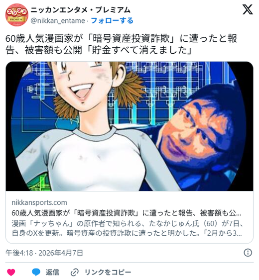60歳人気漫画家が「暗号資産投資詐欺」に遭ったと報告、被害額も公開「貯金すべて消えました」 https://t.co/gHgRO2ifNI— ニッカンエンタメ・プレミアム (@nikkan_entame) April 7, 2026