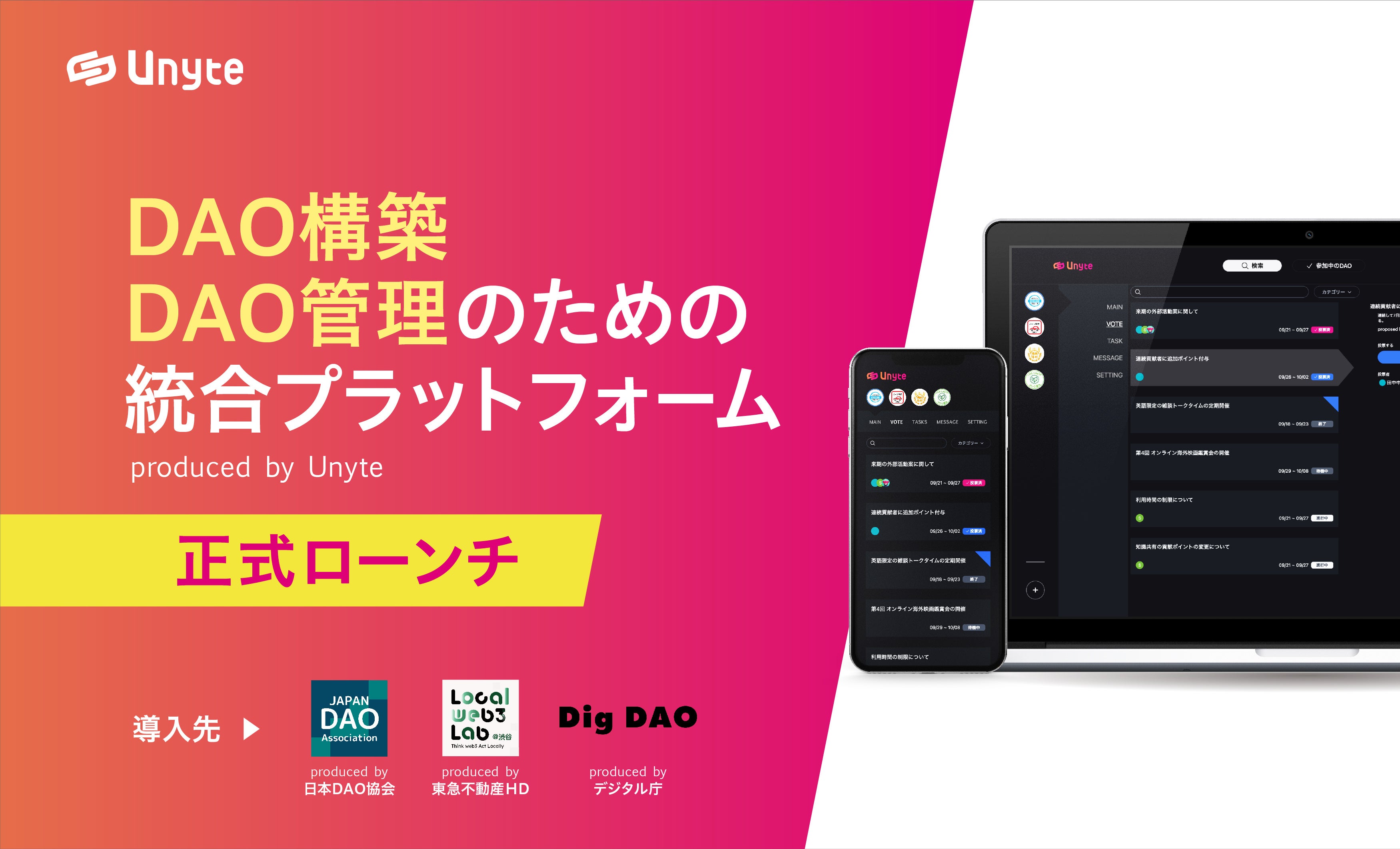 株式会社Unyte国内外のDAOおよびコミュニティ支援事業を行う株式会社Unyteが、DAOの構築および高度な運用管理を支援する統合プラットフォーム「Unyte」を正式ローンチ