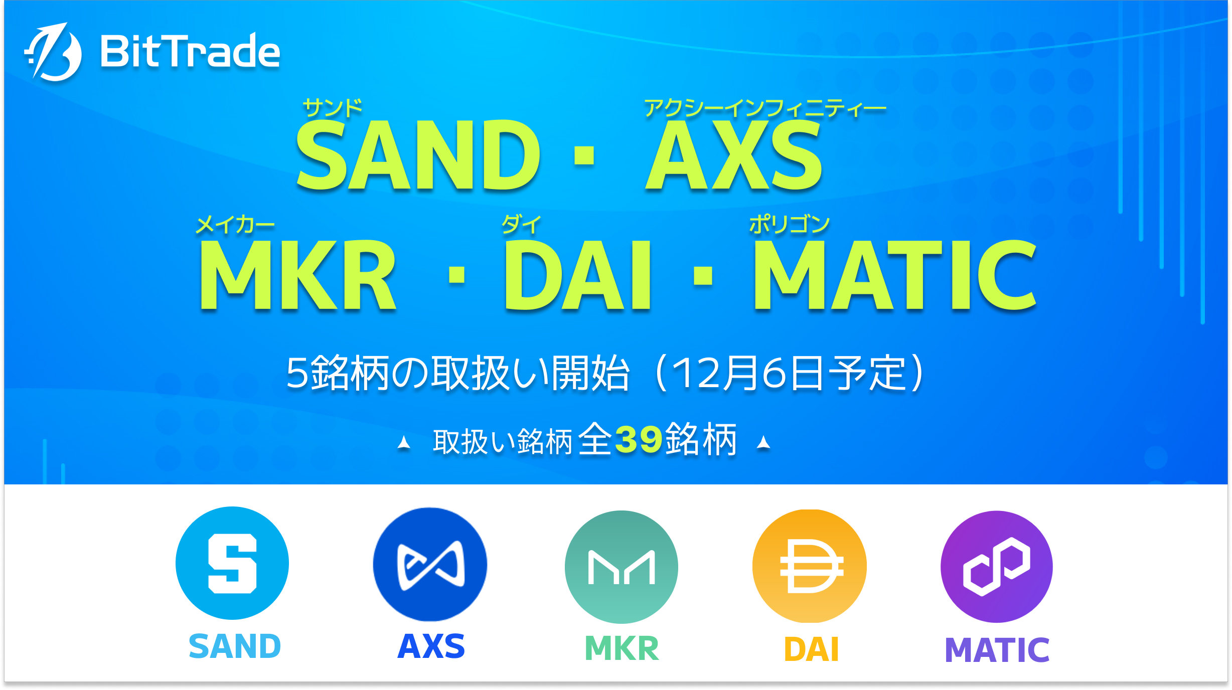 ビットトレード、 サンド(SAND)・アクシーインフィニティ(AXS)・メイカー(MKR)・ダイ(DAI)・ポリゴン(MATIC)の取扱い開始に関するお知らせ